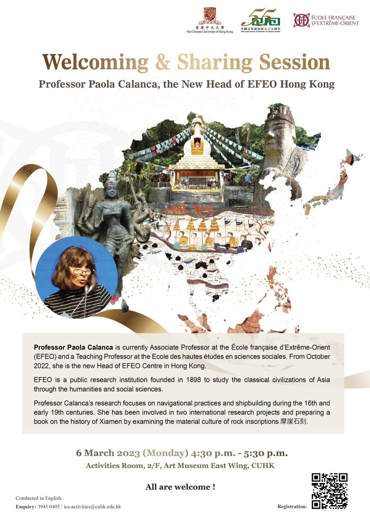 Professor Paola Calanca is currently Associate Professor at the École française d’Extrême-Orient (EFEO) and a teaching professor at the Ecole des hautes études en sciences sociales. From October 2022, she is the new Head of EFEO Centre in Hong Kong.
