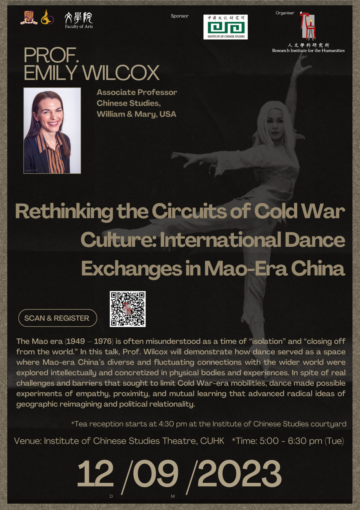 The Mao era (1949 – 1976) is often misunderstood as a time of “isolation” and “closing off from the world.” In this talk, Professor Wilcox will demonstrate how dance served as a space where Mao-era China’s diverse and fluctuating connections with the wider world were explored intellectually and concretized in physical bodies and experiences. In spite of real challenges and barriers that sought to limit Cold War-era mobilities, dance made possible experiments of empathy, proximity, and mutual learning that advanced radical ideas of geographic reimagining and political relationality.