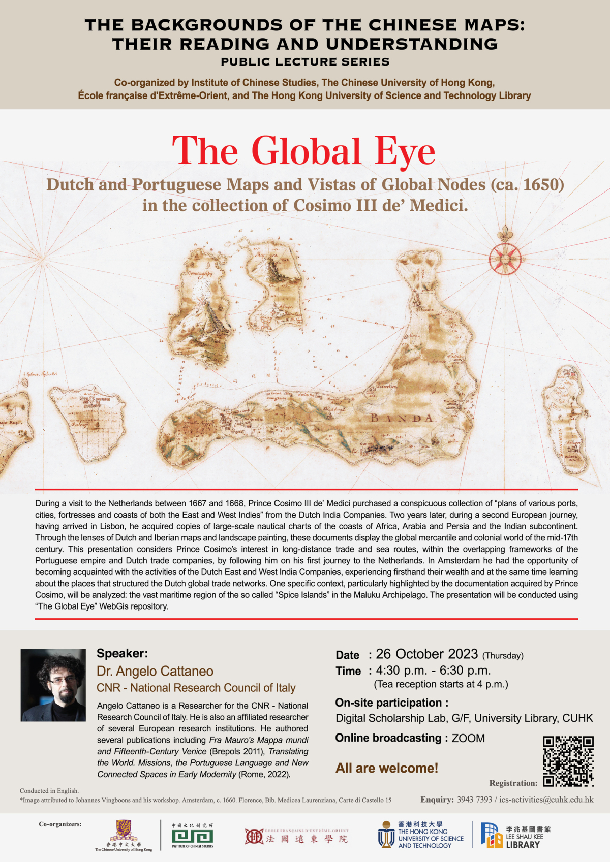During a visit to the Netherlands between 1667 and 1668, Prince Cosimo III de’ Medici purchased a conspicuous collection of “plans of various ports, cities, fortresses and coasts of both the East and West Indies” from the Dutch India Companies. Two years later, during a second European journey, having arrived in Lisbon, he acquired copies of large-scale nautical charts of the coasts of Africa, Arabia and Persia and the Indian subcontinent. Through the lenses of Dutch and Iberian maps and landscape painting, these documents display the global mercantile and colonial world of the mid-17th century. This presentation considers Prince Cosimo’s interest in long-distance trade and sea routes, within the overlapping frameworks of the Portuguese empire and Dutch trade companies, by following him on his first journey to the Netherlands. In Amsterdam he had the opportunity of becoming acquainted with the activities of the Dutch East and West India Companies, experiencing firsthand their wealth and at the same time learning about the places that structured the Dutch global trade networks. One specific context, particularly highlighted by the documentation acquired by Prince Cosimo, will be analyzed: the vast maritime region of the so called “Spice Islands” in the Maluku Archipelago. The presentation will be conducted using “The Global Eye” WebGis repository.