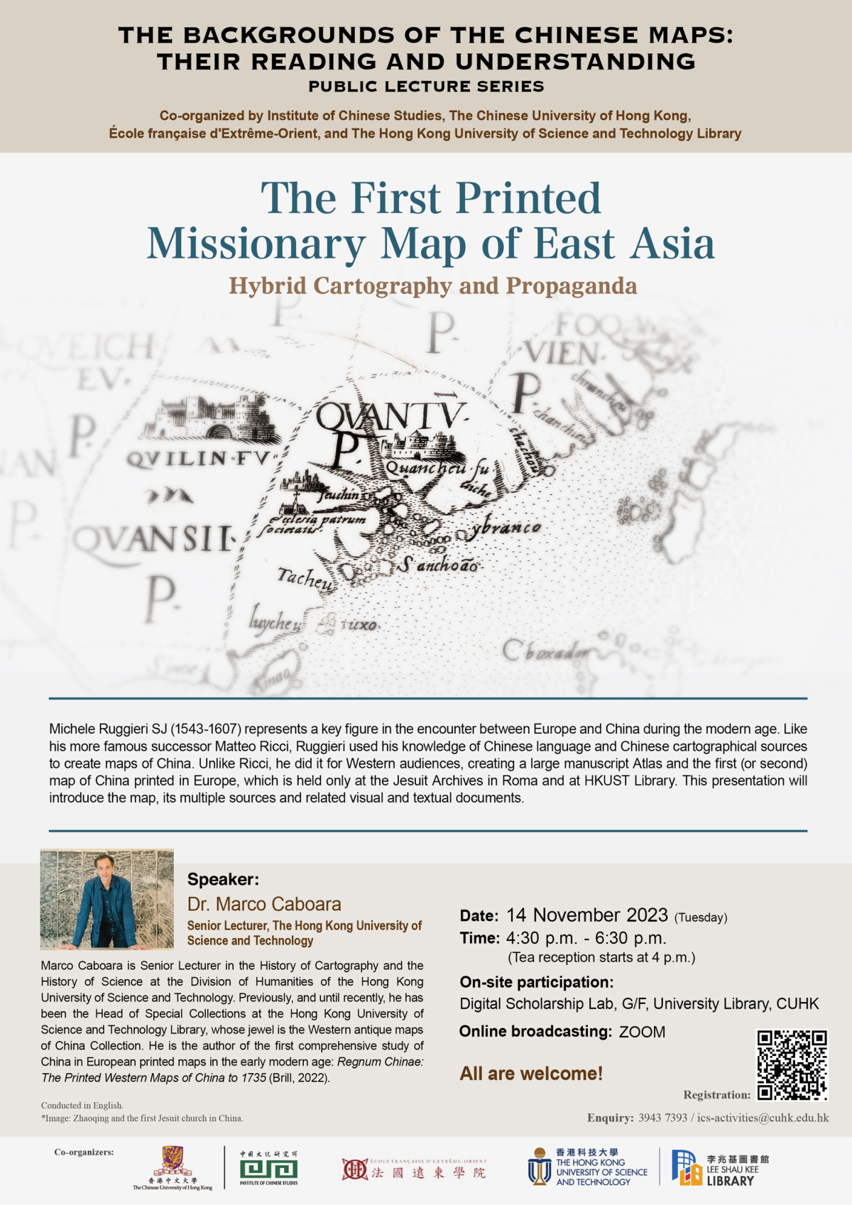 Michele Ruggieri SJ (1543-1607) represents a key figure in the encounter between Europe and China during the modern age. Like his more famous successor Matteo Ricci, Ruggieri used his knowledge of Chinese language and Chinese cartographical sources to create maps of China. Unlike Ricci, he did it for Western audiences, creating a large manuscript Atlas and the first (or second) map of China printed in Europe, which is held only at the Jesuit Archives in Roma and at HKUST Library. This presentation will introduce the map, its multiple sources and related visual and textual documents.