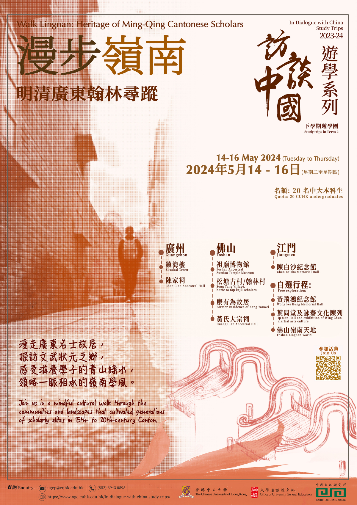 The best way to enjoy the prime of spring is perhaps to have a good walk with your friends. In this study trip, we will walk through the traditional quarters in Guangzhou, Foshan and Jiangmen to visit the fine residences, ancestral temples, gardens and villages of a selection of great Ming-Qing Cantonese scholars, whose esteem and excellence in learning intertwines with the local architecture and nature, and whose spiritual world and life philosophy remain a true inspiration today.