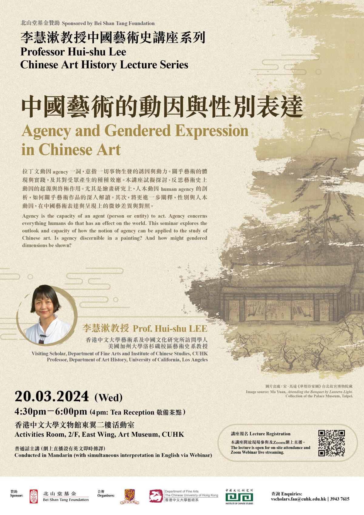 Speaker: Prof. Hui-shu LEE (Visiting Scholar, Department of Fine Arts and Institute of Chinese Studies, CUHK; Professor, Department of Art History, University of California, Los Angeles), Professor of Art History at UCLA. She received her doctorate degree from Yale University in 1994 after working in the Palace Museum, Taipei. Her field of specialization is Chinese painting and visual culture in the pre-modern era, with a particular focus on gender issues. She also works extensively on representations of place, cultural mapping, and gardens. Among her publications are Exquisite Moments: West Lake & Southern Song Art (New York: China Institute, 2001) and Empresses, Art, and Agency in Song Dynasty China (Seattle: University of Washington Press, 2010). She is currently completing a book titled Picturing West Lake: the Poetics and Representation of An Iconic Place.