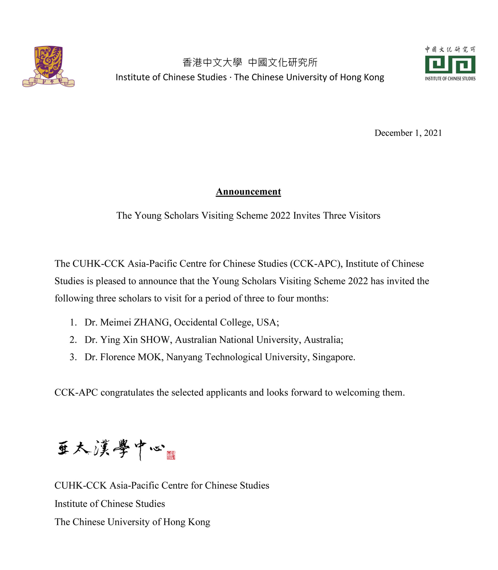 CCK-APC Young Scholars Visiting Scheme 2022 - Invites Three Visitors