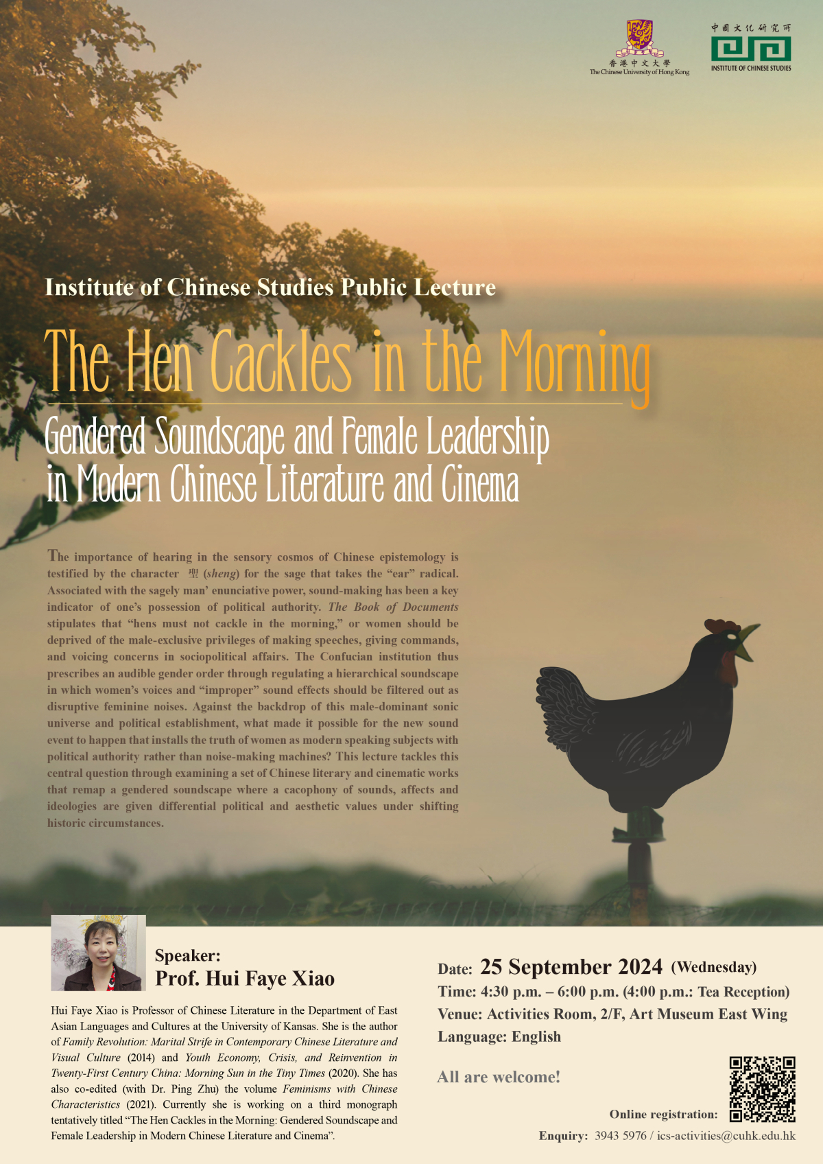 The importance of hearing in the sensory cosmos of Chinese epistemology is testified by the character 聖 (sheng) for the sage that takes the “ear” radical. Associated with the sagely man’ enunciative power, sound-making has been a key indicator of one’s possession of political authority. The Book of Documents stipulates that “hens must not cackle in the morning,” or women should be deprived of the male-exclusive privileges of making speeches, giving commands, and voicing concerns in sociopolitical affairs. The Confucian institution thus prescribes an audible gender order through regulating a hierarchical soundscape in which women’s voices and “improper” sound effects should be filtered out as disruptive feminine noises. Against the backdrop of this male-dominant sonic universe and political establishment, what made it possible for the new sound event to happen that installs the truth of women as modern speaking subjects with political authority rather than noise-making machines? This lecture tackles this central question through examining a set of Chinese literary and cinematic works that remap a gendered soundscape where a cacophony of sounds, affects and ideologies are given differential political and aesthetic values under shifting historic circumstances.