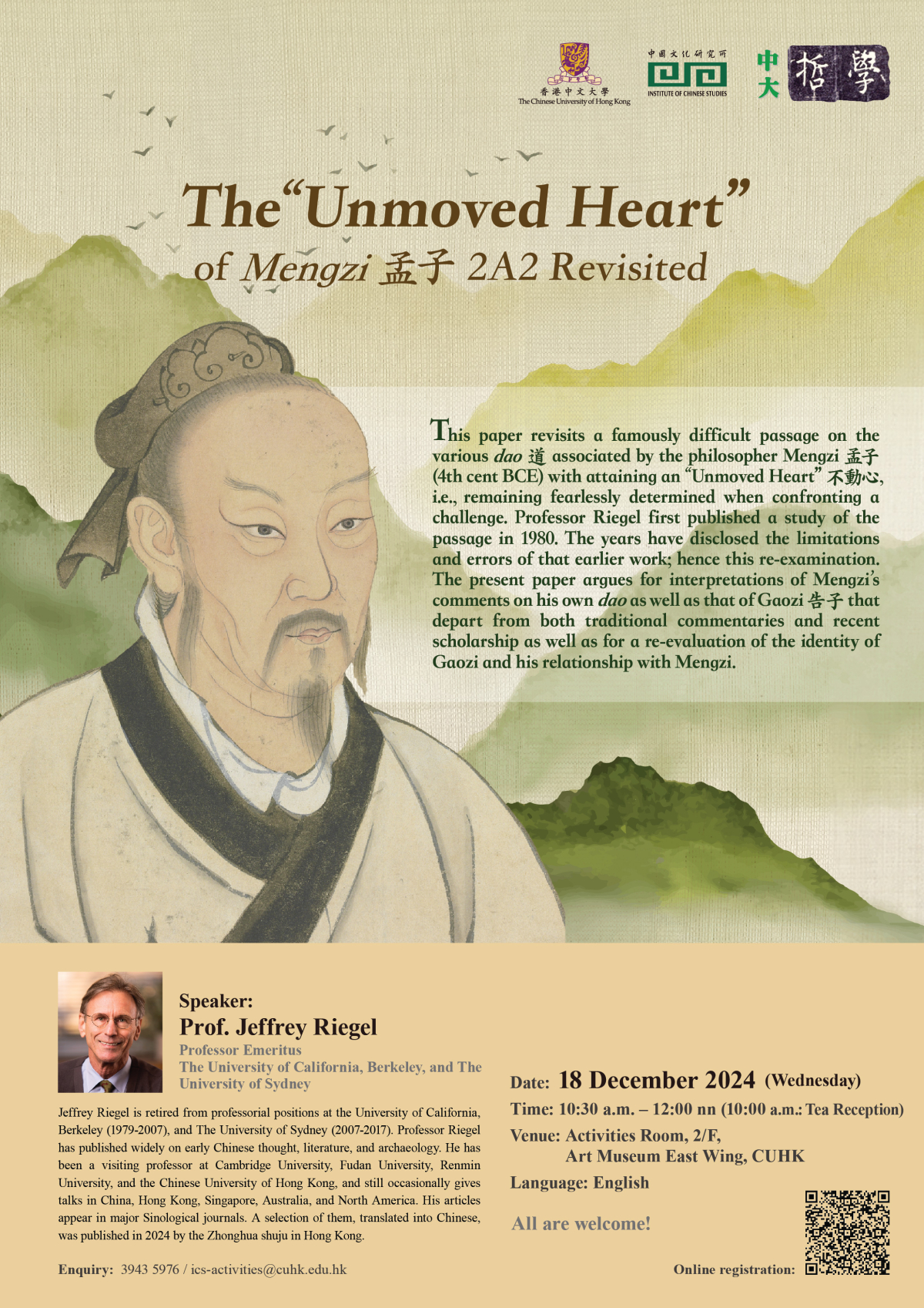Prof. Jeffrey Riegel is retired from professorial positions at the University of California, Berkeley (1979-2007), and The University of Sydney (2007-2017). Professor Riegel has published widely on early Chinese thought, literature, and archaeology. He has been a visiting professor at Cambridge University, Fudan University, Renmin University, and the Chinese University of Hong Kong, and still occasionally gives talks in China, Hong Kong, Singapore, Australia, and North America. His articles appear in major Sinological journals. A selection of them, translated into Chinese, was published in 2024 by the Zhonghua shuju in Hong Kong.