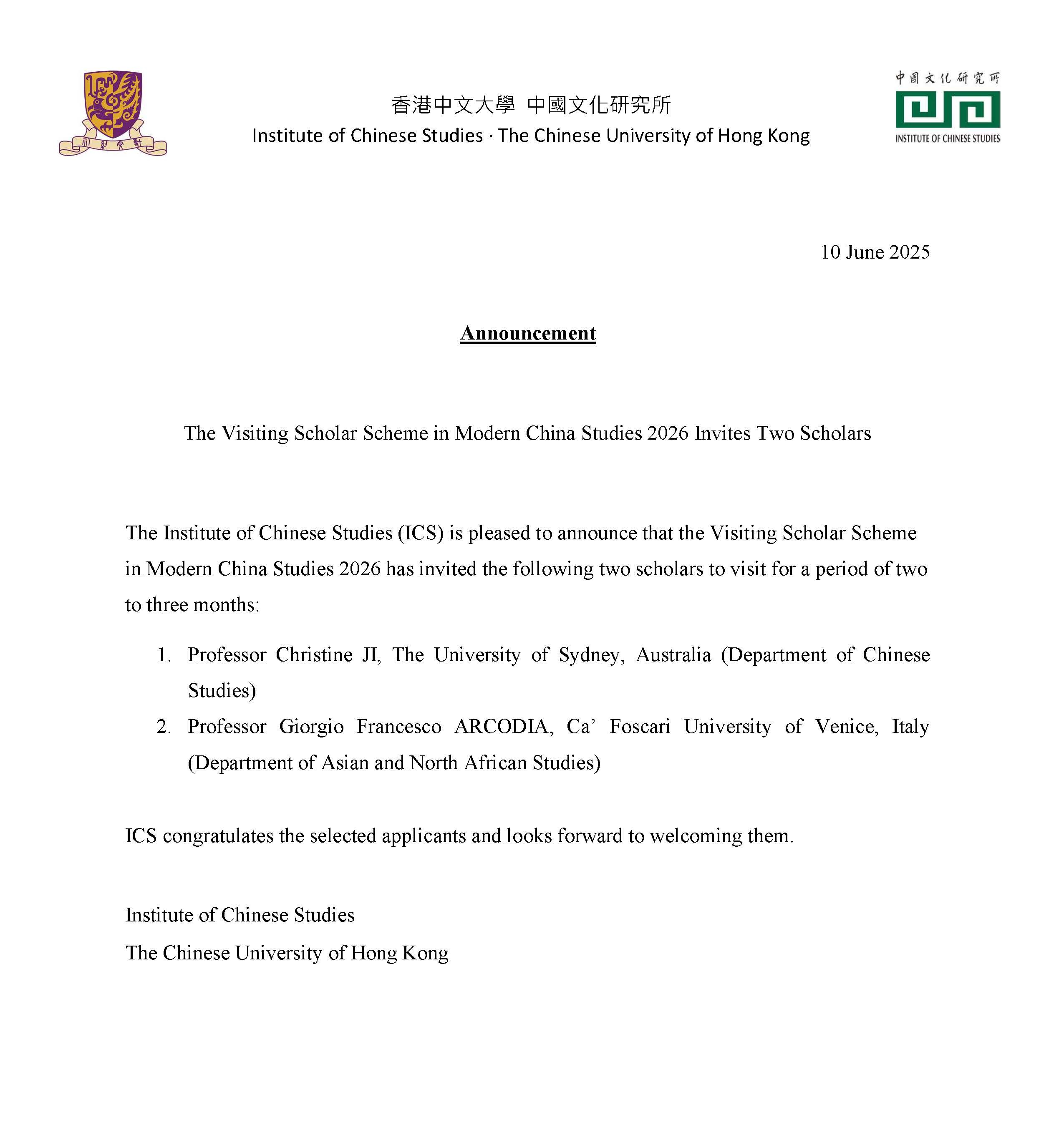 Visiting Scholar Scheme in Modern China Studies 2026 - Invites Two Scholars