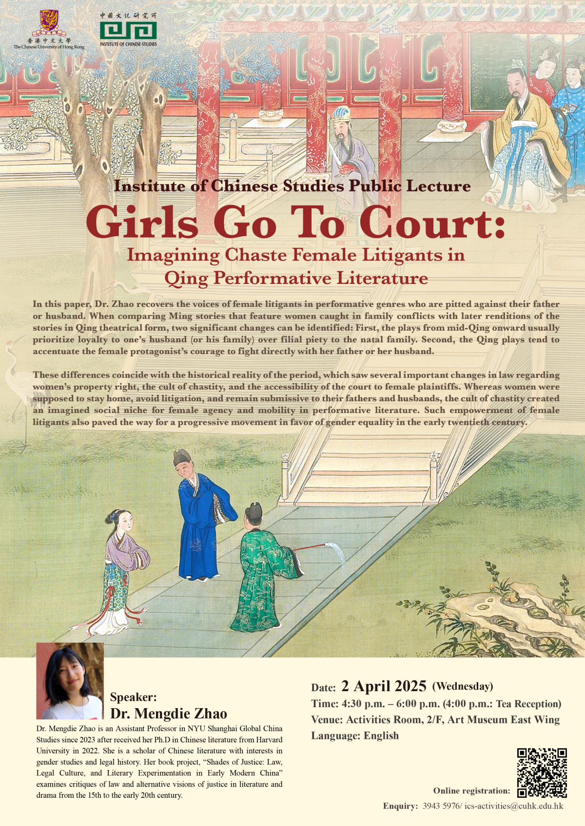 In this paper, Dr. Zhao recovers the voices of female litigants in performative genres who are pitted against their father or husband. When comparing Ming stories that feature women caught in family conflicts with later renditions of the stories in Qing theatrical form, two significant changes can be identified: First, the plays from mid-Qing onward usually prioritize loyalty to one’s husband (or his family) over filial piety to the natal family. Second, the Qing plays tend to accentuate the female protagonist’s courage to fight directly with her father or her husband.