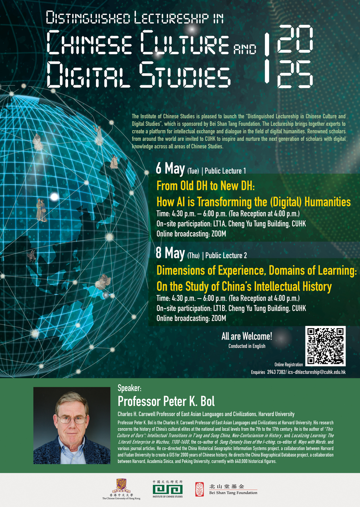 The Institute of Chinese Studies is pleased to launch the “Distinguished Lectureship in Chinese Culture and Digital Studies”, which is sponsored by Bei Shan Tang Foundation. The Lectureship brings together experts to create a platform for intellectual exchange and dialogue in the field of digital humanities. Renowned scholars from around the world are invited to CUHK to inspire and nurture the next generation of scholars with digital knowledge across all areas of Chinese Studies.