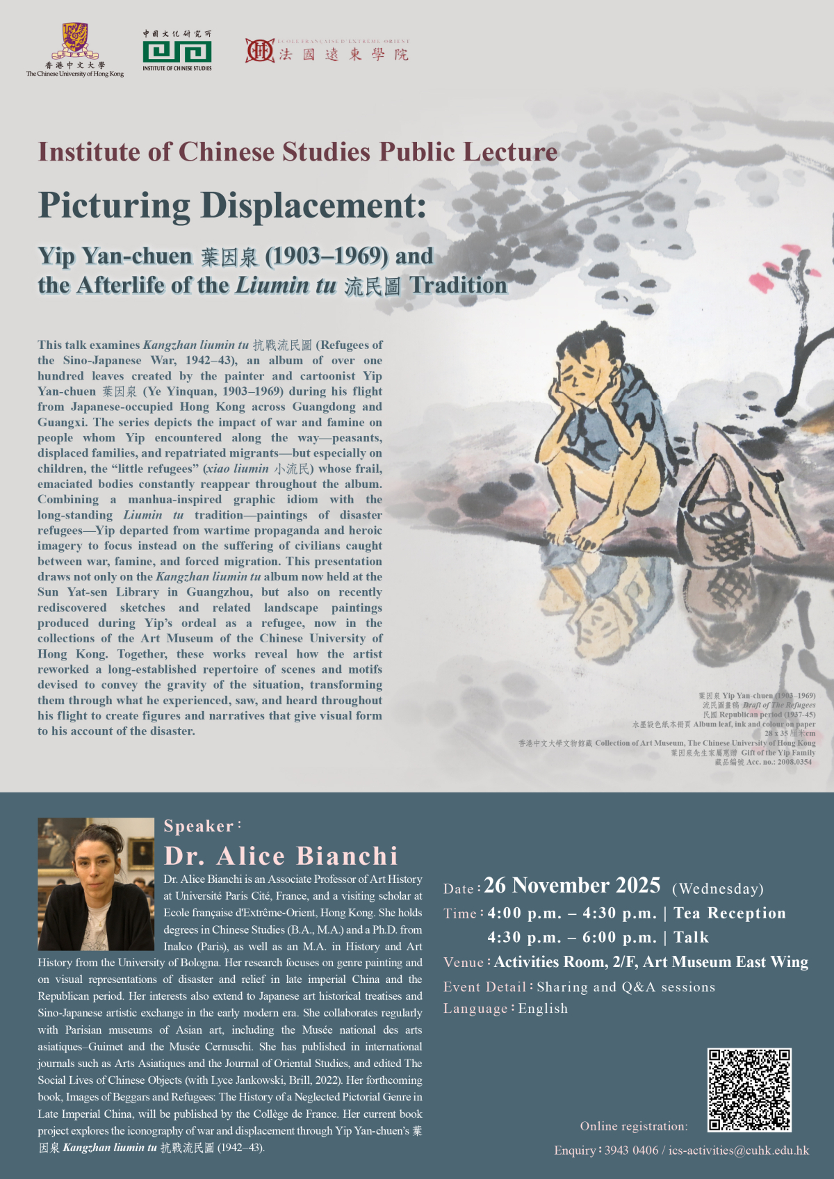 This talk examines Kangzhan liumin tu 抗戰流民圖 (Refugees of the Sino-Japanese War, 1942–43), an album of over one hundred leaves created by the painter and cartoonist Yip Yan-chuen 葉因泉 (Ye Yinquan, 1903–1969) during his flight from Japanese-occupied Hong Kong across Guangdong and Guangxi. The series depicts the impact of war and famine on people whom Yip encountered along the way—peasants, displaced families, and repatriated migrants—but especially on children, the “little refugees” (xiao liumin 小流民) whose frail, emaciated bodies constantly reappear throughout the album. Combining a manhua-inspired graphic idiom with the long-standing Liumin tu tradition—paintings of disaster refugees—Yip departed from wartime propaganda and heroic imagery to focus instead on the suffering of civilians caught between war, famine, and forced migration. This presentation draws not only on the Kangzhan liumin tu album now held at the Sun Yat-sen Library in Guangzhou, but also on recently rediscovered sketches and related landscape paintings produced during Yip’s ordeal as a refugee, now in the collections of the Art Museum of the Chinese University of Hong Kong. Together, these works reveal how the artist reworked a long-established repertoire of scenes and motifs devised to convey the gravity of the situation, transforming them through what he experienced, saw, and heard throughout his flight to create figures and narratives that give visual form to his account of the disaster.