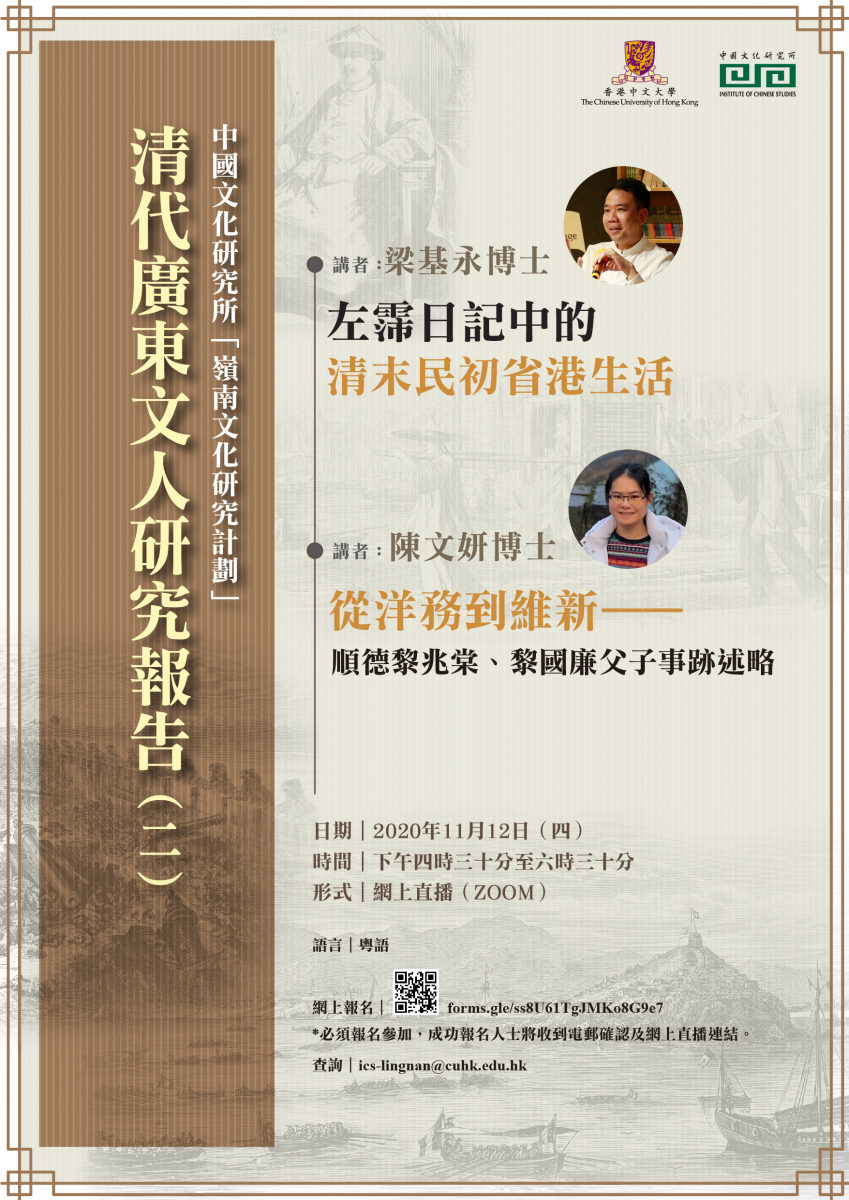 日期:2020年11月12日(四) 時間:下午四時三十分至六時三十分 形式:網上直播(ZOOM) 語言:粵語