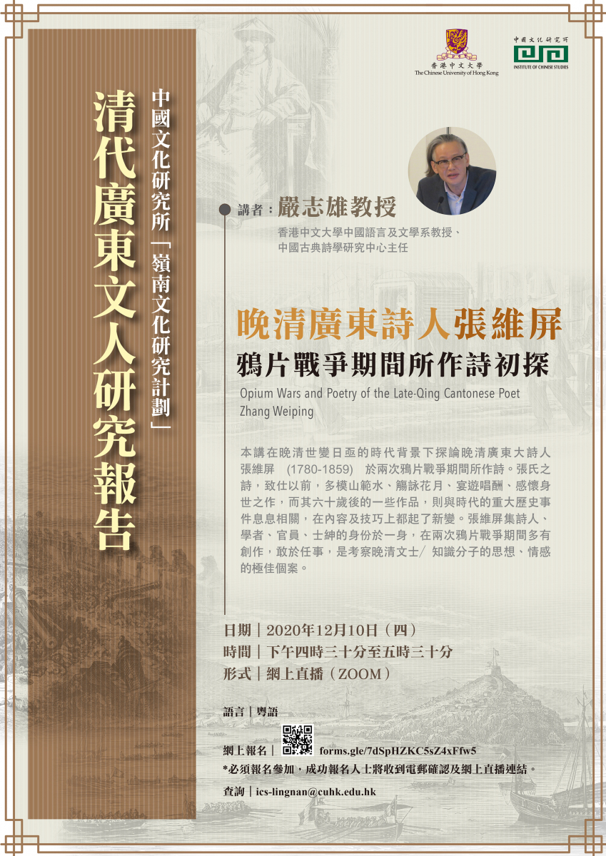 Professor Yim Chi Hung Lawrence spoke on the topic “Opium Wars and Poetry of the Late-Qing Cantonese Poet Zhang Weiping” on 10 December 2020.