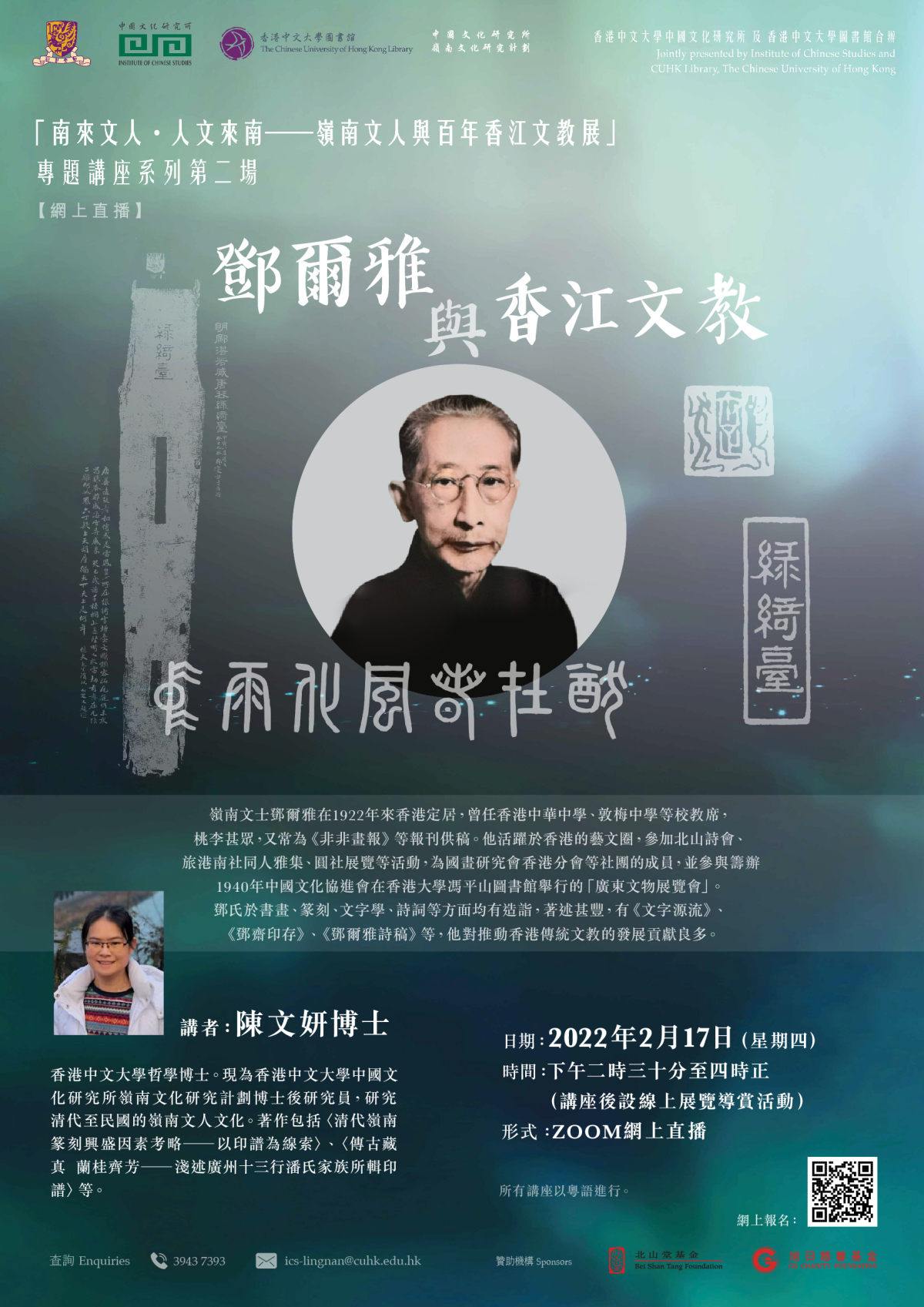 “Southbound Intellectuals and Their Legacy: Lingnan Literati’s Contribution to a Century of Hong Kong Education” Lecture Series is now open for registration.  These lectures will be conducted in Cantonese.