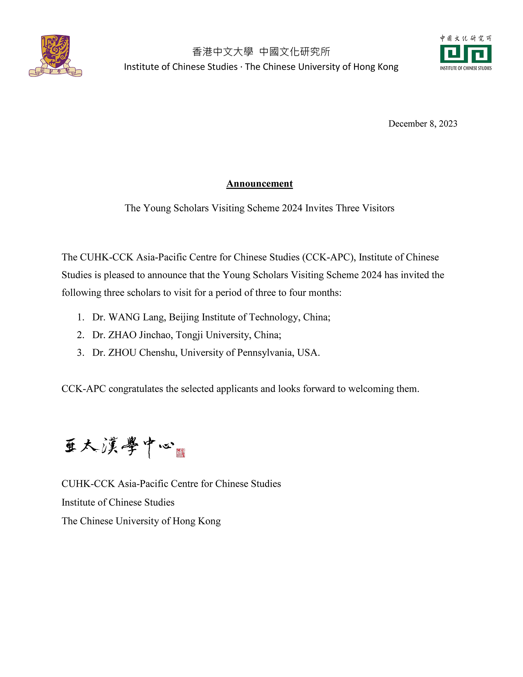 「蔣經國基金會亞太漢學中心」青年學者訪問計劃2024──公佈邀請名單